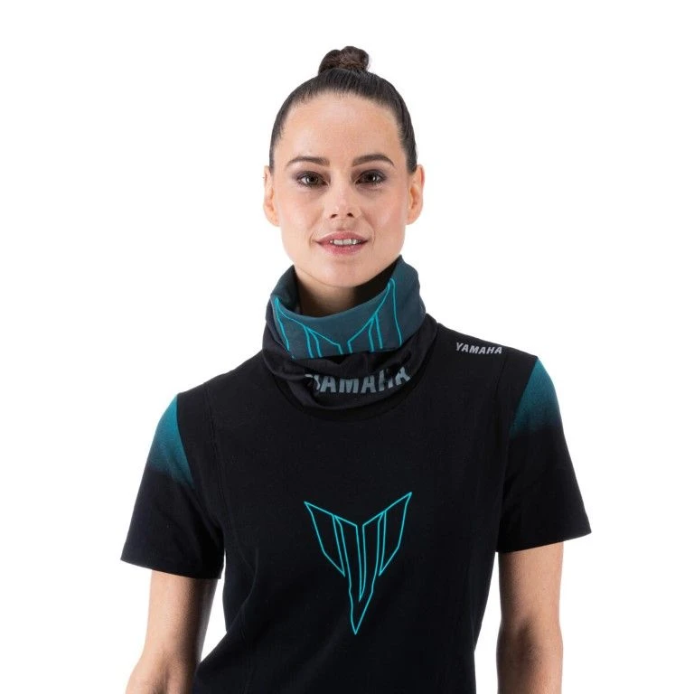 De Hyper Naked nekwarmer is de perfecte aanvulling op de volledige kledinglijn en is een zeer aanpasbaar item voor rijden op verharde wegen en verkennen in de buitenlucht. De uitvoering in polyester met ‘stealth’ zwart vervagend naar cyaan zorgt voor een zeer zacht gevoel dat de elementen buiten houdt. Een gesublimeerd MT-logo en het Yamaha-logo zorgen voor een stedelijke look die helemaal bij de Dark Side past.
